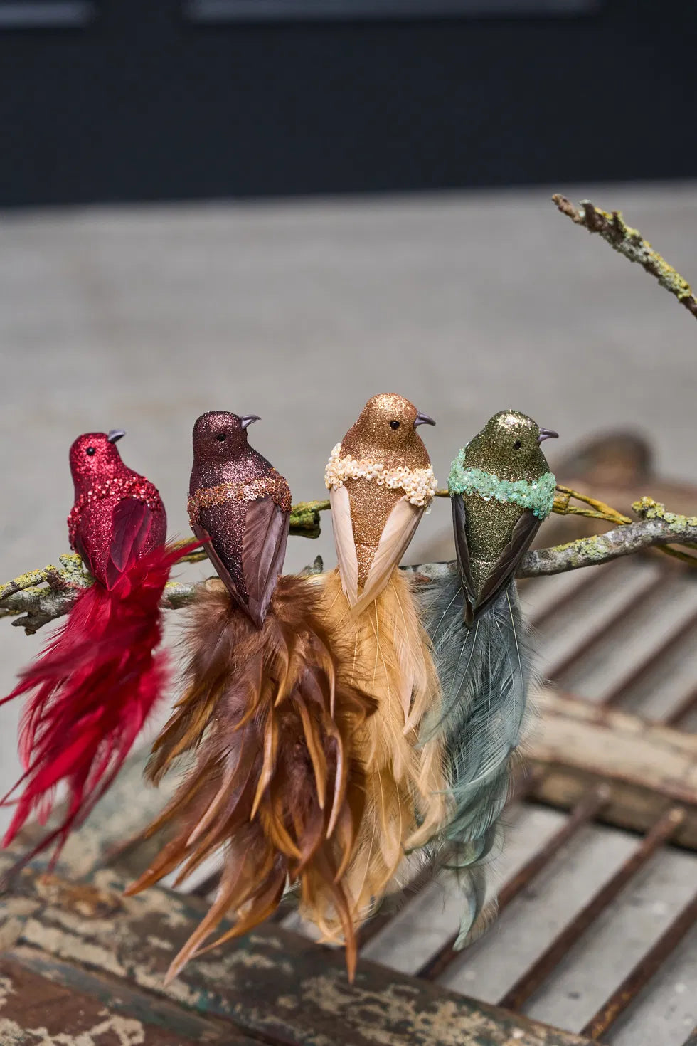 Smukke fugle med klips, lige til at klipse på bordpynten, grandekorationer, gren fra loftet eller juletræet.