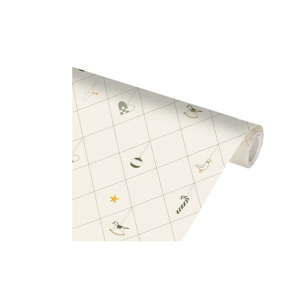 Indpakningspapiret er enkelt med motiv af juleornamenter som er holdt simpelt og enkelt og vil uden tvivl give nogle smukt indpakkede gaver.