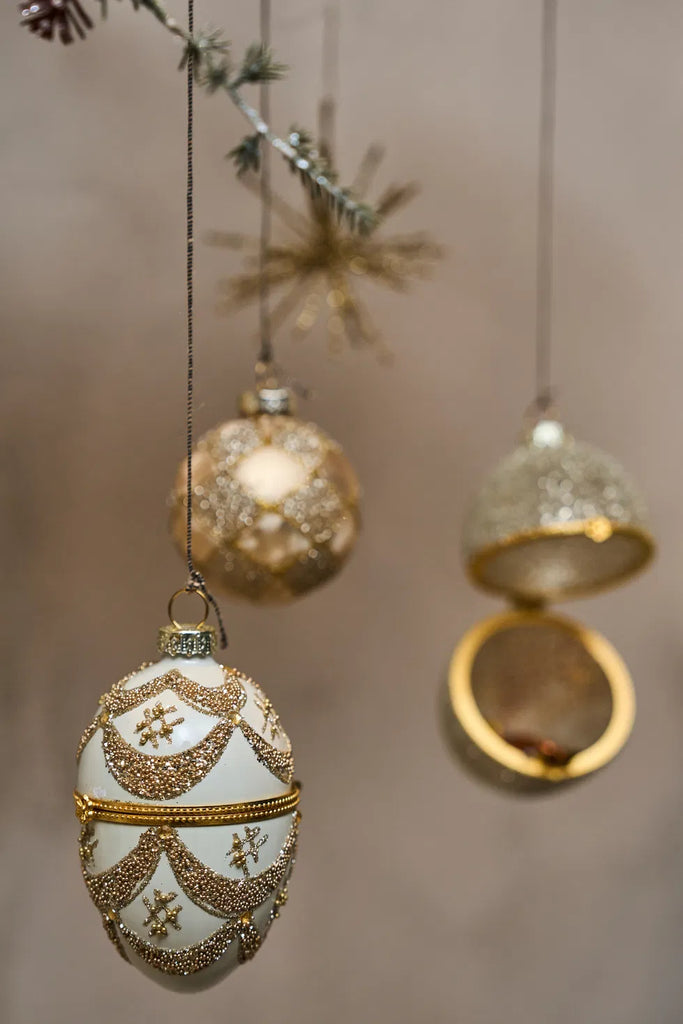 Smukke i glas som uden tvivl vil pynte på juletræet. Helt unikt kan disse æg åbnes.