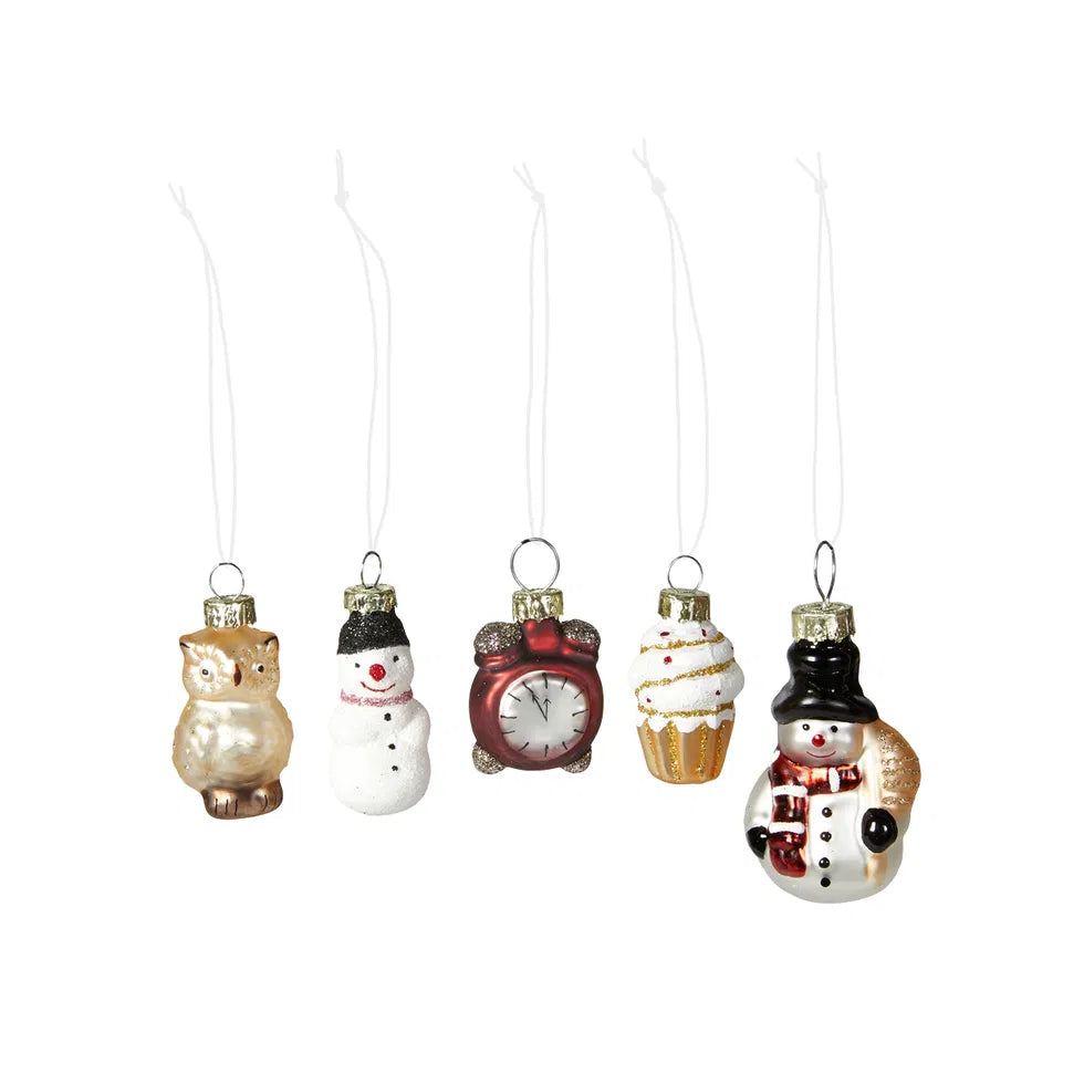 Fine, søde ornamenter i glas. Ugle, Snemand, Ur, cupcake og stor snemand.